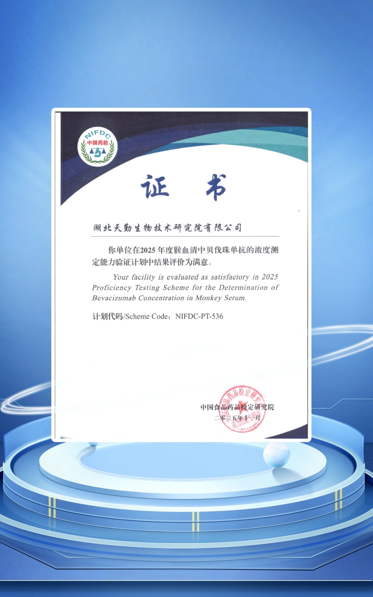 近日,天勤生物核心研發(fā)機(jī)構(gòu)天勤研究院(以下稱“天勤研究院”)在中國食品藥品檢定研究院(以下稱“中檢院”)組織開展的 “2025年度猴血清中貝伐珠單抗的濃度測(cè)定能力驗(yàn)證”(計(jì)劃代碼:NIFDC-PT-536)中,全部樣本檢測(cè)結(jié)果準(zhǔn)確,結(jié)果評(píng)價(jià)為 “滿意”。