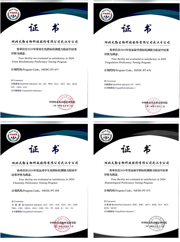 在血清中生化指標(biāo)(NIFDC-PT-509)、血液學(xué)指標(biāo)(NIFDC-PT-475)、血凝學(xué)指標(biāo)(NIFDC-PT-476)和尿生化指標(biāo)(NIFDC-PT-477)四個(gè)關(guān)鍵項(xiàng)目的能力驗(yàn)證過程中,天勤生物武漢分公司提交了全部37個(gè)能力驗(yàn)證指標(biāo),且所有項(xiàng)目均以滿分100分通過,最終獲得“滿意”的最高等級(jí)認(rèn)定。在臨床檢驗(yàn)領(lǐng)域,天勤生物武漢公司不僅配備了先進(jìn)的儀器設(shè)備,還建立了完善的實(shí)驗(yàn)室質(zhì)量控制體系,并擁有一支高技能的專業(yè)團(tuán)隊(duì),這一系列優(yōu)異的成績(jī)充分展示了天勤生物武漢分公司在臨床檢驗(yàn)領(lǐng)域的扎實(shí)功底。