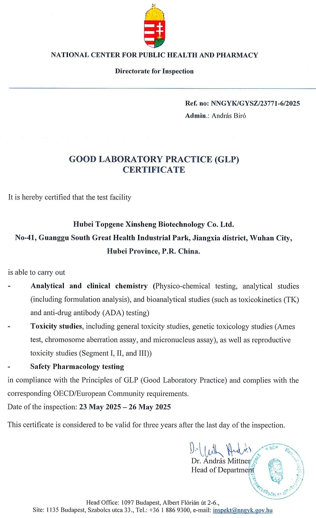 近日,湖北天勤鑫圣生物科技有限公司(以下簡稱:“天勤鑫圣”)收到OECD成員國匈牙利國家公共衛生和藥品中心(NNGYK)頒發的GLP證書,認證內容包括“分析和臨床化學(包括制劑分析、生物分析如TK,ADA等)”、“毒性試驗(包括一般毒性、遺傳毒性和生殖毒性等)”和“安全藥理學試驗”。