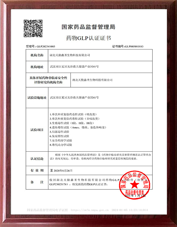 湖北天勤生物武漢分公司(安全性評價中心)是湖北省第一家民營GLP研究機構,現有一支近300人的專業技術團隊,具備了開展中國NMPA、美國FDA項目的質量管理體系和資質,同時通過了國際AAALAC完全認證。公司目前擁有超過10000m2 的設施,可開展嚙齒類和非嚙齒類的單次給藥、重復給藥、生殖【大鼠I、II和III段;小鼠I、II和III段;兔II和兔III段;伴隨食蟹猴(性成熟)重復給藥毒性試驗的生育力評價研究、食蟹猴伴隨胎盤屏障和血乳屏障的EFD試驗和增強的圍產期發育(ePPND)毒性試驗】、遺傳毒性(Ames、微核和染色體畸變)、免疫原性、安全藥理、局部刺激、毒代動力學和致癌等9項GLP試驗以及藥效、藥代動力學、毒性探索性試驗(DRF)等,尤其在生物制品、化藥和中藥和兒科用藥等方面擁有大量的非臨床評價經驗和成功案例,同時在上述藥物的生殖與發育毒性試驗設計、結果判定等方面積累了寶貴的經驗;建立了國內領先的食蟹猴生殖毒性與發育毒性研究平臺,是國家科技部重大創新藥制科技重大專項的藥物安全性評價示范平臺之一。